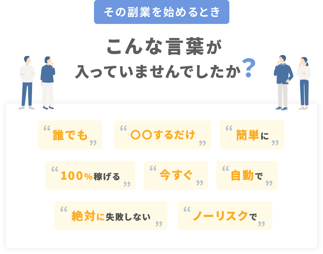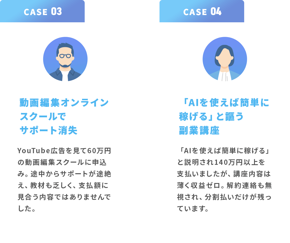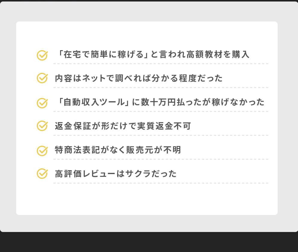 ・説明と実際の内容が違う(サポートがない、内容が薄い、追加課金が前提など)