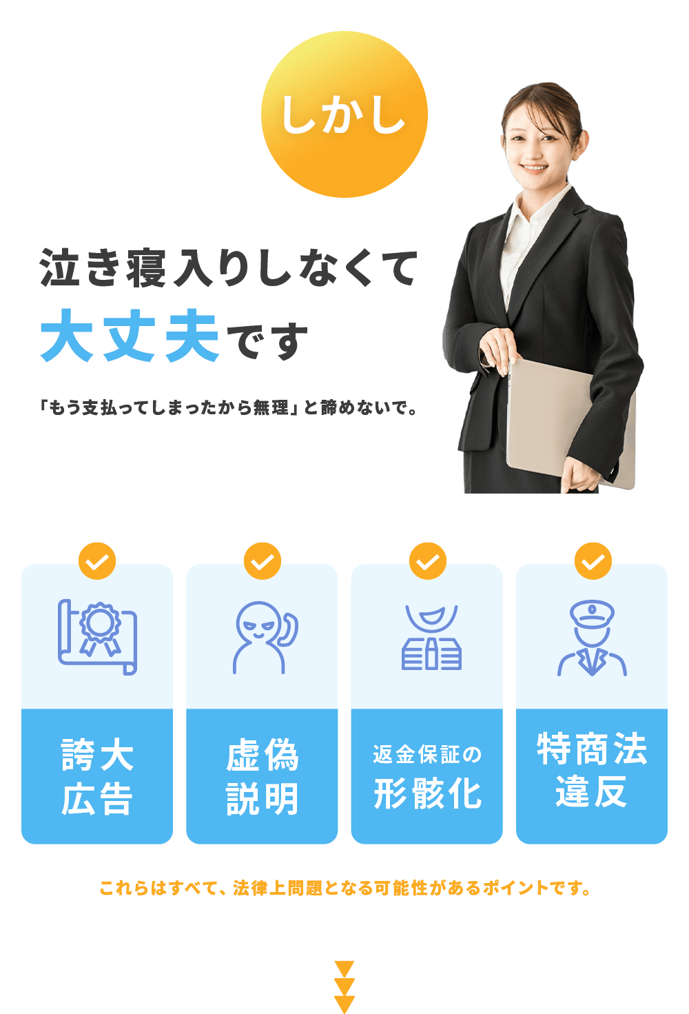それだけで諦める必要はありません。書いてあっても、契約の経緯や説明の内容によっては返金や解約を主張できる場合があります。
