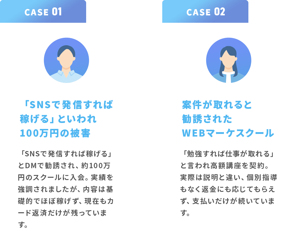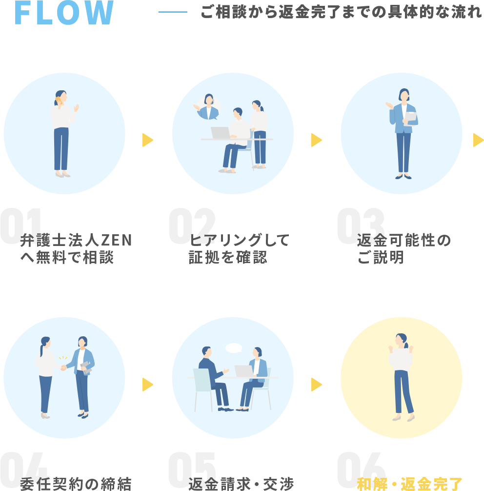 「返金不可と書いてあるから無理」と言われて泣き寝入りする方も多いので、まずは契約までの流れを一緒に確認します。
